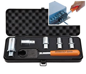 » SKINMATIC® QUICK Set 1 4 tamaños (M12, 16, 20, 25), una única herramienta; una solución óptima para alta densidad de prensaestopas, de fácil instalación en espacios muy angostos; fácil y seguro de usar, con un sistema de trinquete abierto; Ahorro significativo de tiempo y dinero.